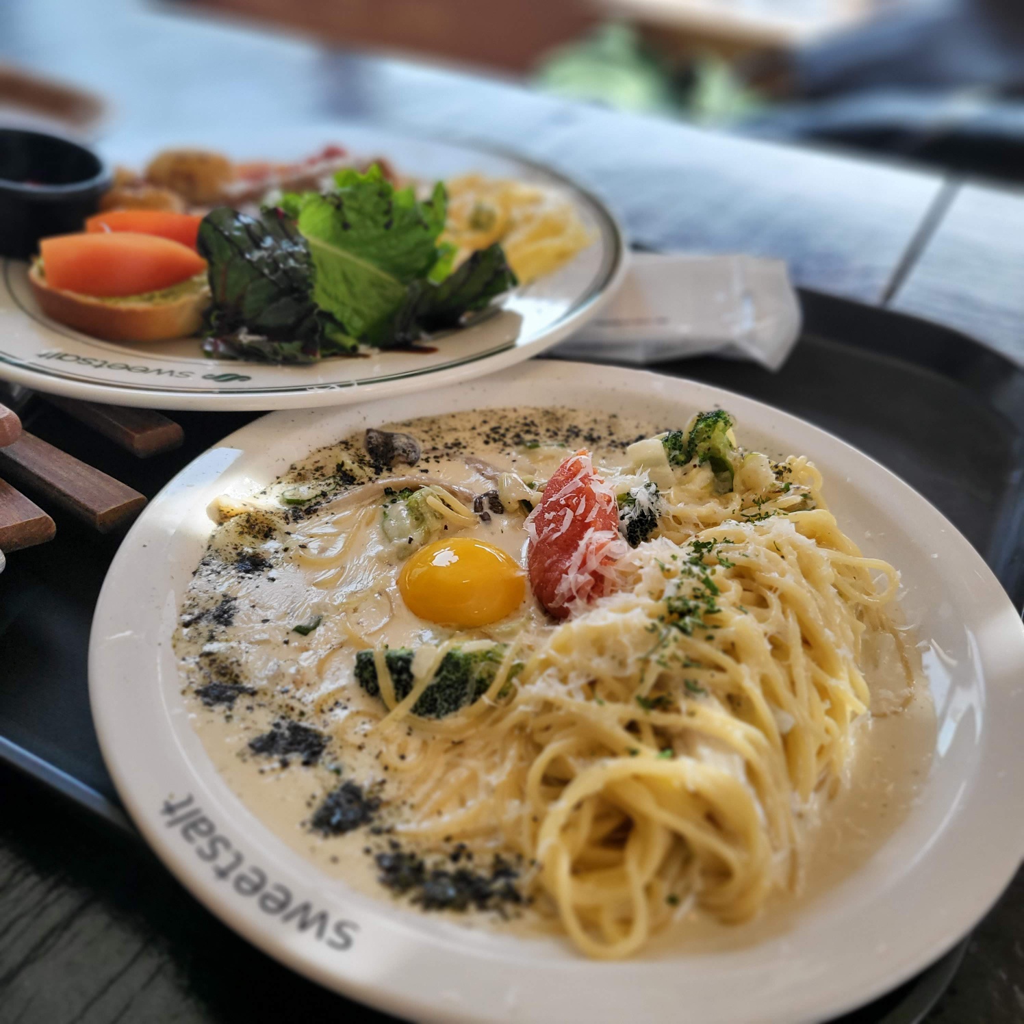 소세지, 저염베이컨, 알감자, 감자브레드, 스크램블에그로 이루어진 아메리칸 플래터와 크림파스타를 시켰습니다