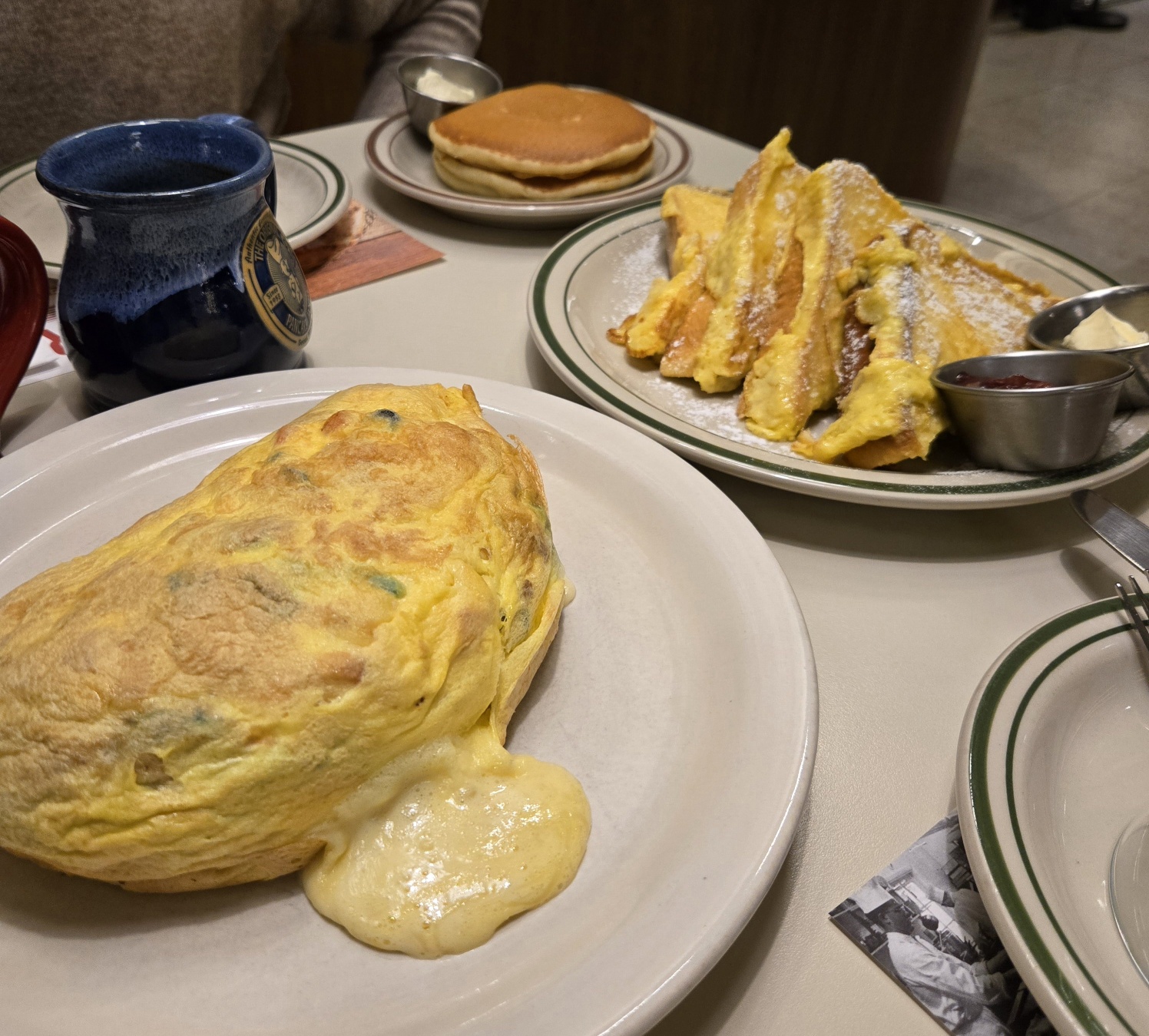 ✔️ 오믈렛세트: 부드러운 오믈렛에 팬케이크 3장이 함께 나와요~ 버터와 딸기잼을 곁들여 먹으면 환상적이에요^^