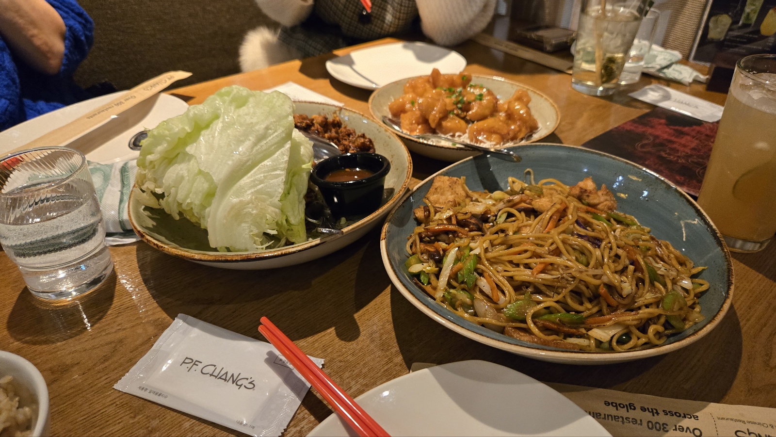 창스 치킨 레터스 랩을 포함해서 크리스피 허니 쉬림프와 면요리인 로메인을 시켰습니다